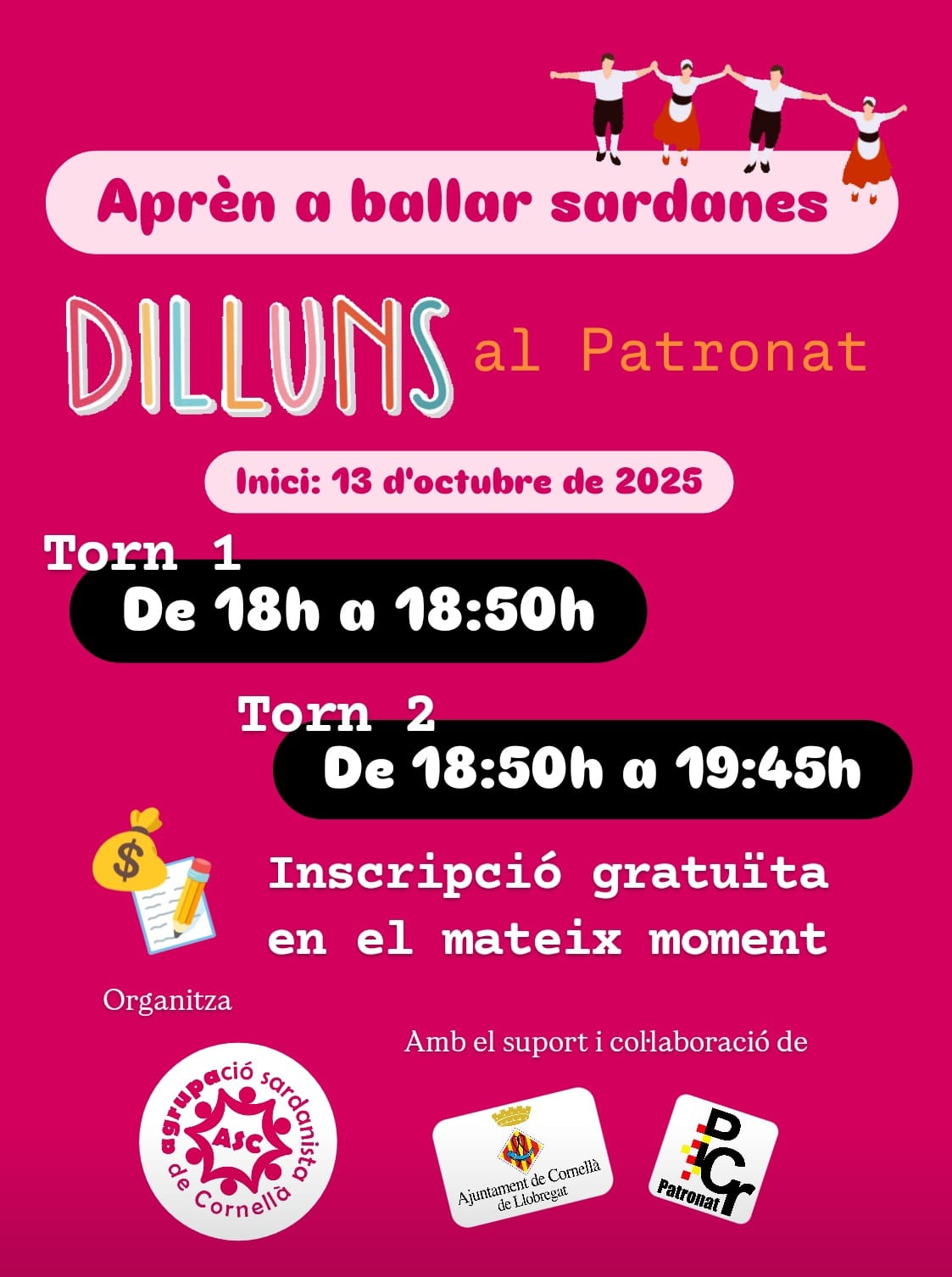 A més, a partir del 13 d'octubre podeu aprendre a ballar sardanes. Tots els dilluns hi haurà dos torns diferents: a les 18h i a les 18:50h, de la mà de l'Agrupació Sardanista de Cornellà.